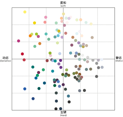 精心篩選出能夠表達人們對顏色的感覺的多個形容詞,然后利用SD方法對不同工作、生活環(huán)境中的1000個人進行了相關 的測試,用于測試的顏色是色相&色調(Tue & Tone)表中的116種不同的顏色。“單色印象空間”就是對這次測試的數(shù)據(jù)進行科學整理后得到的結果。從結果可以獲知,人們對顏色進行評價時,最習慣使 用的4個形容詞是“柔和(Soft)”、“生硬(Hard)”、“動態(tài)(Dynamic)”、“靜態(tài)(Static)。
