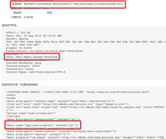 Vary header 加上之后,為了讓百度更好地識別我們的頁面是 PC 還是 Mobile,就需要使用百度自定義的這個 Meta applicable-device 標(biāo)簽了。注意以下來自百度的消息: Meta applicable-device 標(biāo)簽,并非是站點必須標(biāo)注的,現(xiàn)在很多站點沒有標(biāo)記這個標(biāo)簽情況也很好。但這個標(biāo)簽可以幫助百度校驗自己的判斷,并及時進(jìn)行修正。做這個事情又不麻煩,所以我們建議代碼適配站點為了保證效果,還是加這個標(biāo)簽。