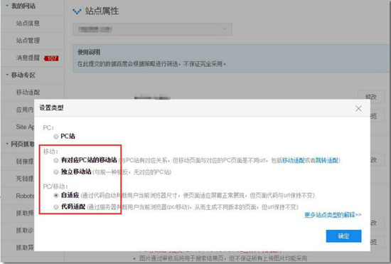 百度站在平臺的設(shè)置里,把網(wǎng)站分為了五類:PC站;有對應(yīng)PC站的移動站;獨立移動站;自適應(yīng)的站點;代碼適配的站點。根據(jù)站點實際情況進(jìn)行設(shè)置,有利于百度蜘蛛在抓取頁面,以及搜索結(jié)果的排名(PC站和M站的搜索結(jié)果展現(xiàn)機制不一樣)。設(shè)置方法如下: