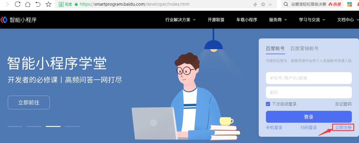 (1)登錄百度小程序官方網(wǎng)址 https://smartprogram.baidu.com/developer/index.html,點(diǎn)“立即注冊(cè)”。