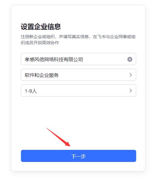 進(jìn)入“設(shè)置企業(yè)信息”界面,填寫(xiě)真實(shí)的企業(yè)名稱(chēng),選擇行業(yè)類(lèi)型、人員規(guī)模,點(diǎn)下一步。