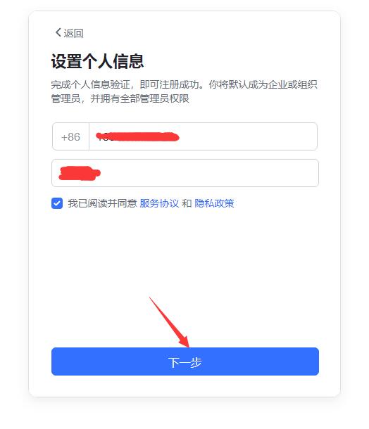 自動(dòng)進(jìn)入“設(shè)置個(gè)人信息”界面,填寫(xiě)手機(jī)號(hào)、姓名,勾選服務(wù)協(xié)議,點(diǎn)下一步。